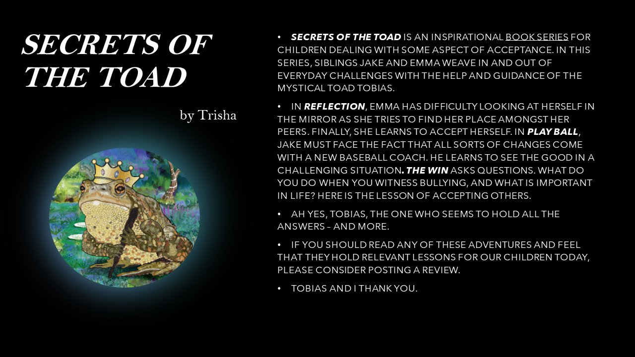 Secrets of The Toad – The Series Series Overview Share this:Share Click to print (Opens in new window) Print Click to share on Facebook (Opens in new window) Facebook Click to email a link to a friend (Opens in new window) Email Like Loading...